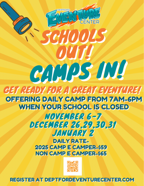WELCOME TO DEPTFORD EVENTURE CENTER! CAMP 2025 INFORMATION ENROLL IN CAMP 2025 PARTY/ROOM RENTALS Kids of all ages (3+) can try a free week of Karate class (Tues, Oct 7 and Thurs, Oct 9). Try it out! Pickleball Walk-Ins $40 for 1 Hour per court$60 for 2 Hours per courtSaturday-SUnday 7am-6pmrequires online reservation Pickleball Sign Up CAMPS PARTY RENTALS Pickleball children’s classes arctic Eventure Ice Cream Rec Leagues team rentals
