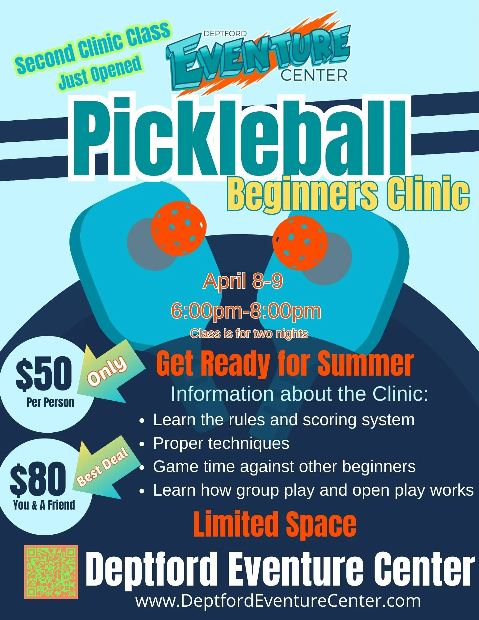 WELCOME TO DEPTFORD EVENTURE CENTER! CAMP 2026 INFORMATION ENROLL IN CAMP 2026 PARTY/ROOM RENTALS Book A Prive Camp Tour Here! Enroll in camp here! We added a New Date as the other clinic is FULL. Sign Up Now! Pickleball $40 for 1 Hour per court$60 for 2 Hours per courtrequires online reservation Pickleball Sign Up CAMPS PARTY RENTALS Pickleball children’s classes arctic Eventure Ice Cream Rec Leagues team rentals